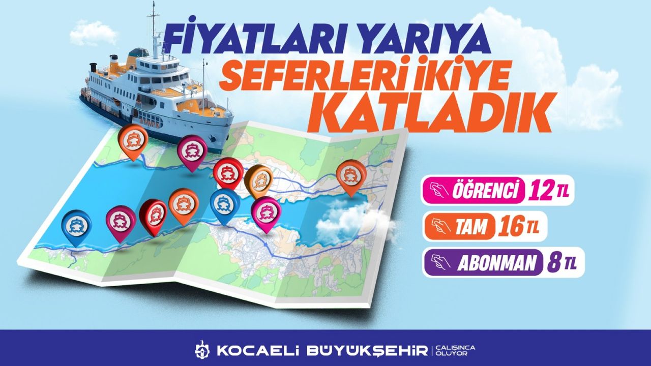 Kocaeli Büyükşehir Belediyesi, 8 Eylül Pazartesi günü itibarıyla deniz ulaşımında kış tarifesine geçiyor. Yeni tarife ile birlikte hem sefer sayıları artırılıyor hem de ücretler yarı yarıya indiriliyor.