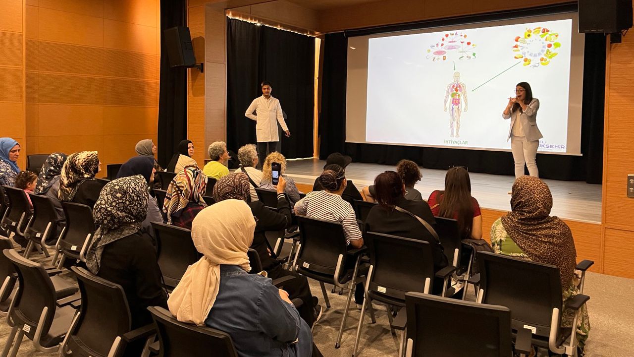 Sindirim sisteminin görmeyle başladığı hatırlatılarak sindirim organlarının sağlıklı çalışması için öneriler paylaşıldı. Ayrıca bağırsak sağlığı ile mental sağlık arasındaki ilişkiye değinildi ve probiyotik ile prebiyotik besinlerin önemi vurgulandı.