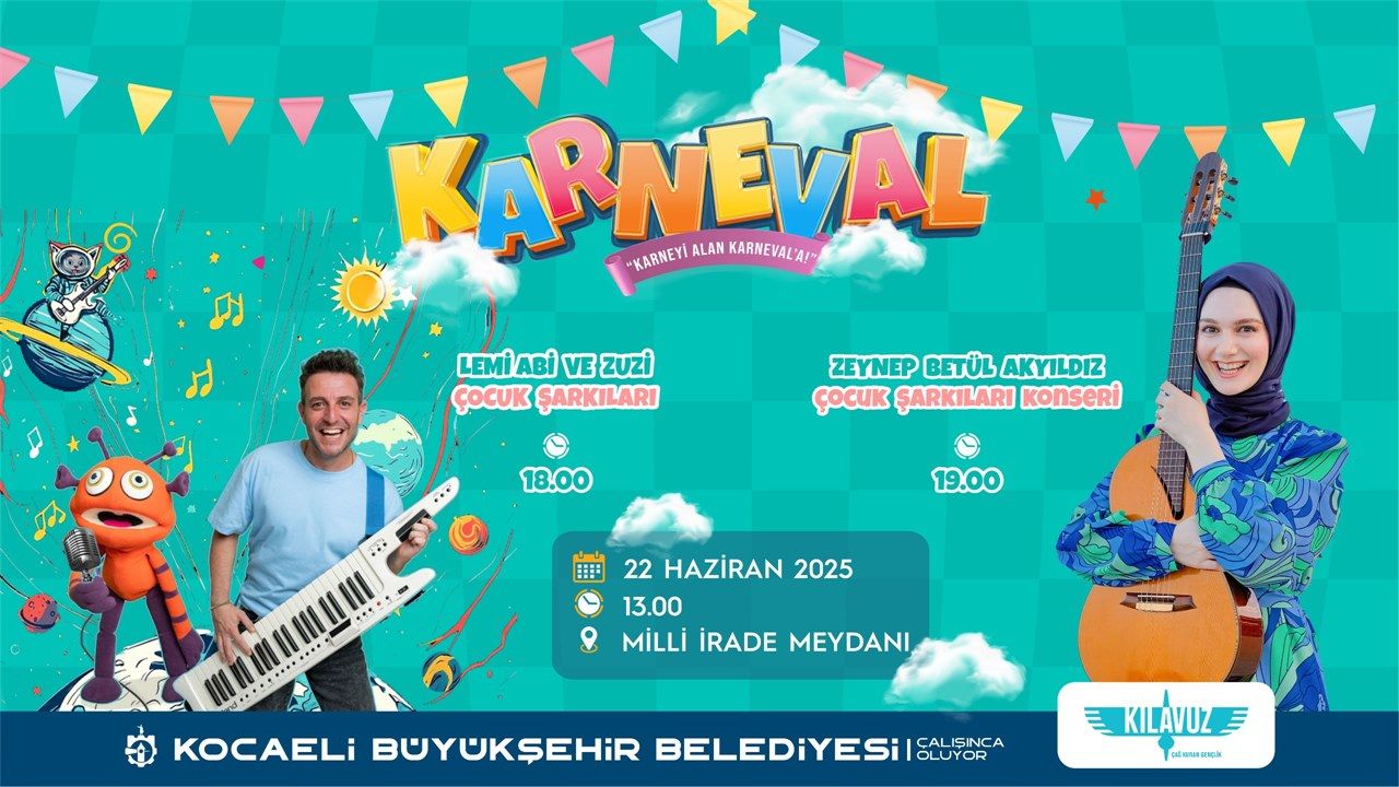 Milli İrade Meydanı’nda saat 13.00’te başlayacak etkinliklerle çocuklar yaz tatiline rengârenk bir başlangıç yapacak. Karnelerini alan tüm çocukların davetli olduğu Karneval Çocuk Şenliği’nde; Lemi Filozof ve Zuzi ile çocuk şarkıları, Zeynep Betül Akyıldız ile müzik dolu anlar, renkli atölyeler, interaktif oyunlar, sahne gösterileri ve spor etkinlikleri çocuklara festival tadında anlar yaşatacak.