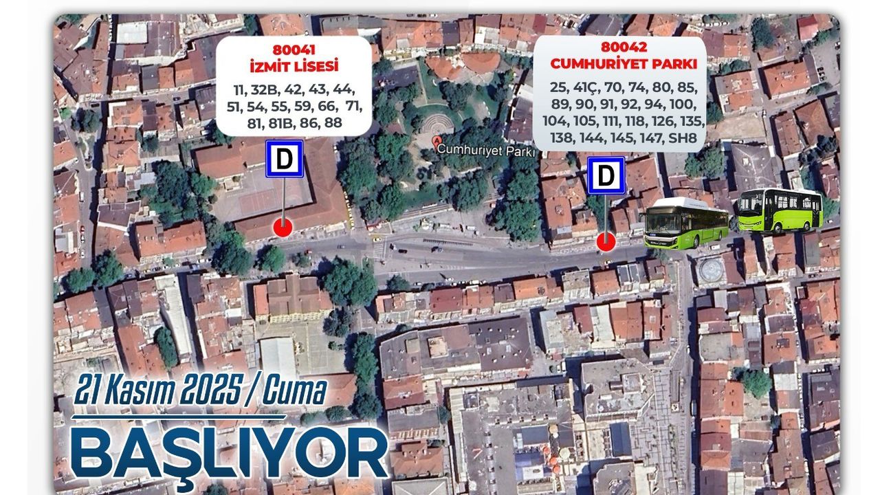 Cumhuriyet Parkı Durağı’ndan geçen 11, 32B, 42, 43, 44, 51, 54, 55, 59, 66, 71, 81, 81B, 86 ve 88 numaralı hatlar, artık 80041 numaralı İzmit Lisesi Durağı’ndan hizmet verecek.