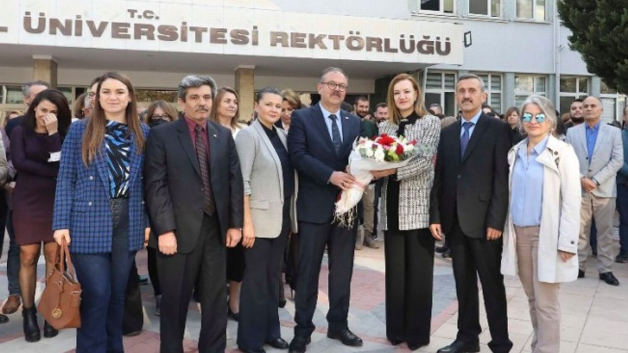 Dokuz Eylül Üniversitesi Rektörlük Binası önünde toplananakademik ve idari personel, Rektör Hotar’a çiçek takdim ederek ve alkışlayarak teşekkürlerini sundu.