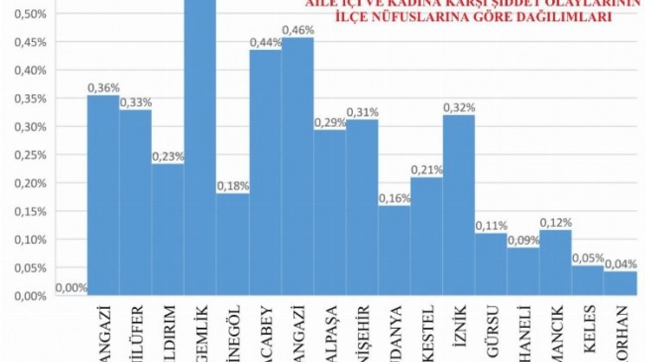 Aile içi ve kadına karşı şiddet olaylarının Nüfusa göre dağılımında Bursa’nın 17 ilçesi, içerisinde yüzde 0.53 ile Gemlik ilk sırada, 0,46 ile Orhangazi ikinci sırada ve 0,44 ile Karacabey üçüncü sırada yer aldığı görüldü.