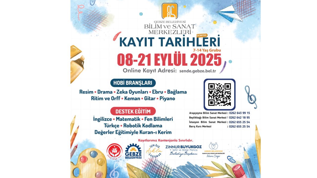 Gebze Belediyesi’nin Bilim ve Sanat Merkezleri için kayıtlar başladı. 8 Eylül – 21 Eylül tarihleri arasında www.sende.gebze.bel.tr adresi üzerinden online olarak yapılacak başvurularda, birbirinden farklı hobi ve destek eğitimleri öğrencilere sunulacak.