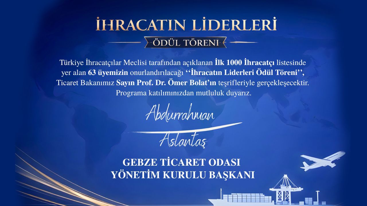 Gebze Ticaret Odası, Türkiye İhracatçılar Meclisi (TİM) tarafından açıklanan İlk 1000 İhracatçı listesinde yer alan firmaları, düzenleyeceği İhracatın Liderleri Ödül Töreni ile onurlandıracak.