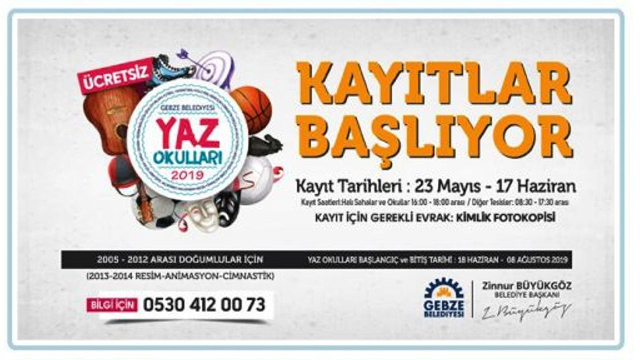 Gebze Belediyesi Yaz Okulları için kayıtlar hafta içi halı saha ve okullarda 16:00-18:00 arası iken diğer kayıt noktalarında 08:30 ile 17:30 arasında gerçekleşecek. Kayıtların gerçekleşeceğiz noktalar ve branşlar; Gebze Kapalı Spor Salonunda Basketbol, voleybol, binicilik, Metin Oktay Stadı, Necmettin Kuyucu Anadolu Lisesi, Umut Halı Saha, 75. Yıl Halı Saha, Sporter Halı Saha, Beylikbağı stadı, Hasyıldız Halı Saha Mollafenari Stadında futbol, İstasyon Bilim Sanat Merkezinde İngilizce, satranç, jimnastik, bağlama, drama, resim, ebru, masa tenisi, zeka oyunları ve Resim,-animasyon-jimnastik, Beylikbağı Bilim Sanat Merkezinde Basketbol, Voleybol, İngilizce, satranç, drama, ebru, bağlama, resim ve zeka oyunları, Arapçeşme Bilim Sanat Merkezinde İngilizce, drama, ebru, bağlama, resim, zeka oyunları, masa tenisi, satranç ve jimnastik Güzel Gelecek Akademisi’nde Resim-Animasyon-Jimnastik, İngilizce ve satranç Gençlik Merkezi’nde Voleybol ve satranç, Mustafa Üstündağ ve Emlak Konut Ortaokulu Spor Salonunda Voleybol ve basketbol, Gebze Olimpik yüzme Havuzunda yüzme, Gebze Olimpik Buz Pisti’nde buz pateni, Gaziler Dağı Atlı Eğitim Merkezi binicilik branşlarında kayıtlar alınacak.