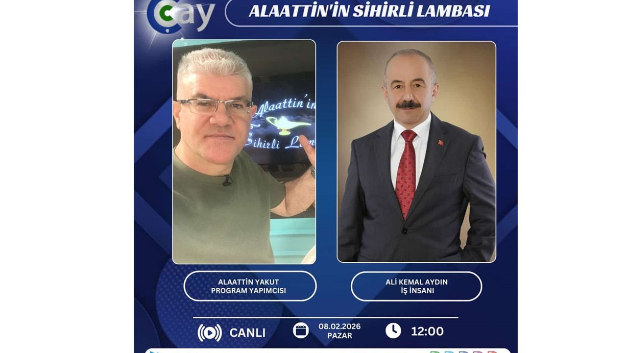 Çay TV ekranlarında Pazar günleri saat 12:00'da yayınlanan, yapımcılığını ve sunuculuğunu Alaaddin Yakut'un yaptığı “Alaaddinin Sihirli Lambası” programının bu haftaki canlı yayın konuğu Gebzeli İş İnsanı Ali Kemal Aydın.