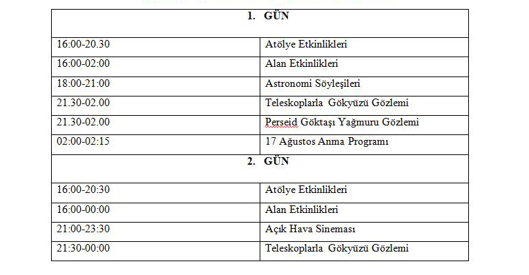 İki gün boyunca alanda Teleskoplarla Gökyüzü Gözlemi, Taşınabilir Planetaryum, Sanal Gerçeklik Deneyim Alanı, Bilim Şov, Açık Hava Sineması (Marslı), Kahoot Bilgi Yarışması, Doğa Sporları, Oryantiring, Kılavuz İzcilik Eğitim ve Kamp Alanı, Ayı Yemeği gibi etkinlikler planlandı.