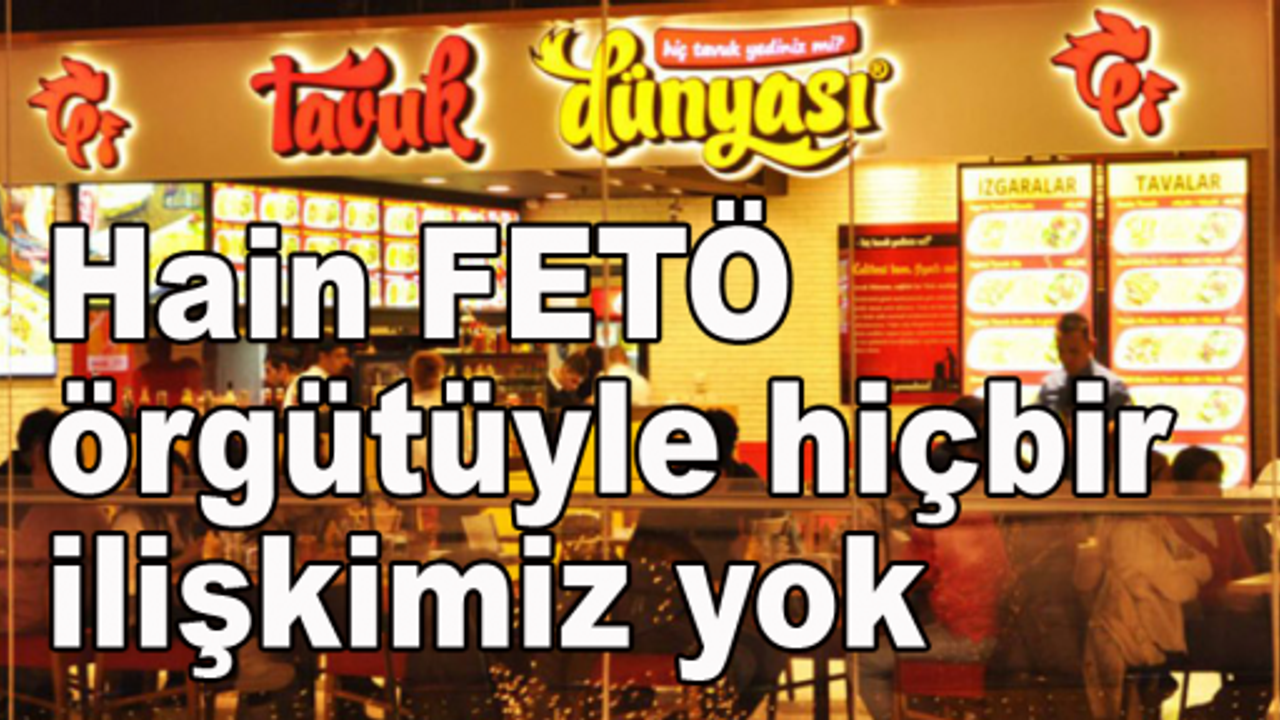 Tavuk Dünyası'nın hain FETÖ ile bir ilişkisi olmamakla birlikte tüm Türkiye genelinde yüzlerce markanın içinde bu örgüte ait bayiler olabileceği gibi bizim bayilerimiz arasında da var olup olmadıkları yönünde çalışmalarımız ve önlemlerimiz sürmektedir. Bu vesile ile ülkemizin geçirdiği bu darbe sürecinin yaralarını çabuk sarmasını ümit eder, devletimize ve milletimize geçmiş olsun dileklerimizi nezdiniz de yinelemek isteriz.