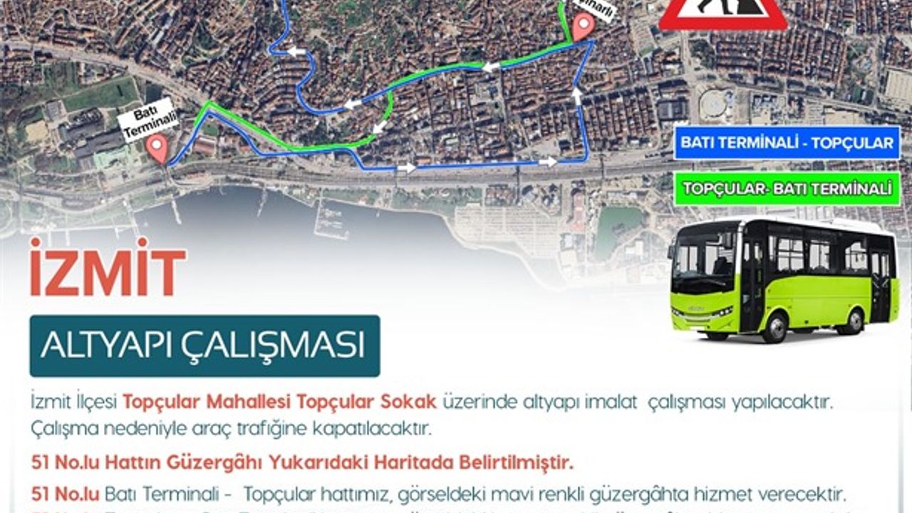 Kocaeli Büyükşehir Belediyesi, İzmit Cedit Mahallesi Topçular Sokak’ta altyapı çalışması başlatıyor. Çalışma kapsamında bu yolu kullanan 51 ve 53 no’lu hatlarda güzergah değişikliği yapılacak.