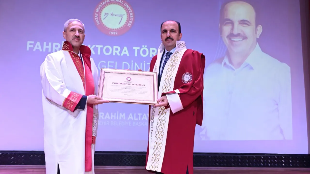 Deprem sonrası Hatay’da Konya Büyükşehir Belediyesi'nin Türkiye’ye örnek çalışmaları dolayısıyla Mustafa Kemal Üniversitesi tarafından Konya Büyükşehir Belediye Başkanı Uğur İbrahim Altay’a Siyaset Bilimi ve Kamu Yönetimi alanında Fahri Doktora ünvanı verildi.KONYA (İGFA) - Kahramanmaraş merkezli 6 Şubat 2023’te yaşanan ve 11 ilde büyük yıkıma yol açan depremlerin ardından Hatay’ı ayağa kaldırmak için gösterdiği gayretlerle gönüllere giren Konya Büyükşehir Belediye Başkanı Uğur İbrahim Altay’a, Hatay Mustafa Kemal Üniversitesi Senatosu’nun aldığı kararla Siyaset Bilimi ve Kamu Yönetimi alanında Fahri Doktora ünvanı takdim edildi.
