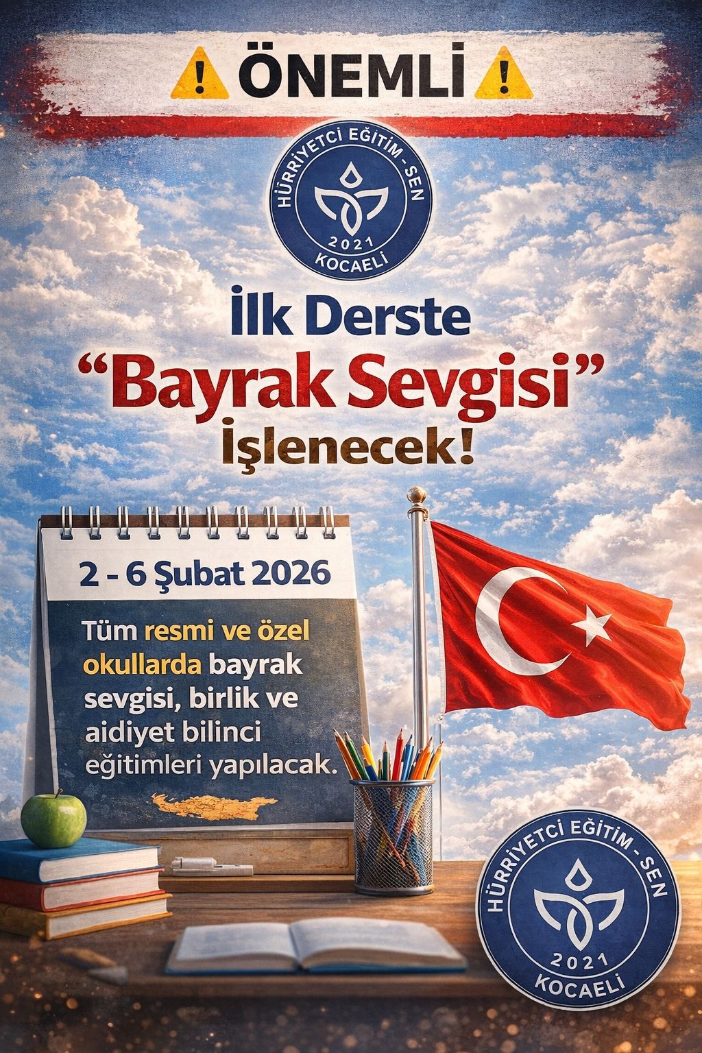 Hürriyetçi Eğitim Sen Gebze İlçe Başkanı Hasan Akgül, 2-6 Şubat tarihleri arasında tüm resmi ve özel okullarda bayrak sevgisi, birlik ve aidiyet bilinci eğitimlerinin verileceğini belirtti.