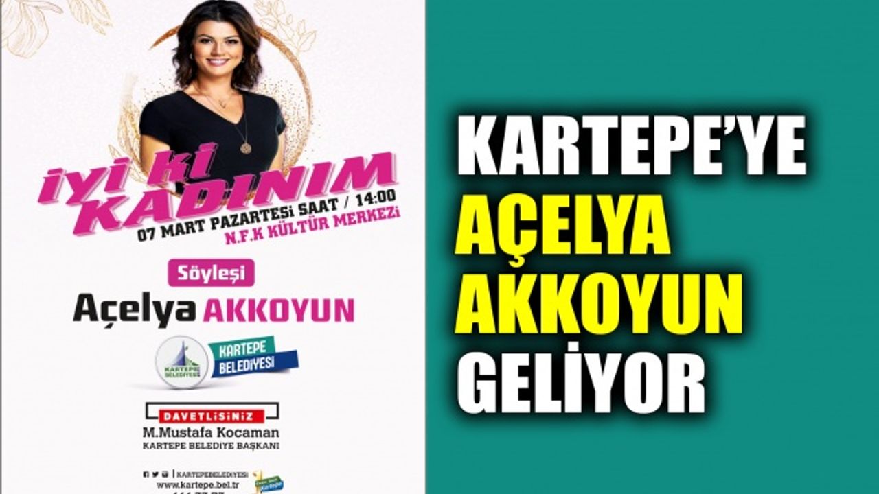 Kartepe Belediyesi Kültür ve Sosyal İşler Müdürlüğü tarafından 07 Mart Pazartesi saat 14.00’de Necip Fazıl Kısakürek Kültür Merkezi’nde düzenlenen programla Açelya Akkoyun, Kartepeli kadınlarla söyleşi de bir araya gelecek. Kartepe Belediye Başkanı Av.M.Mustafa Kocaman, “ Hayatın her anında varlıklarını hissettiğimiz, bizi biz yapan değerli kadınlarımız için düzenleyeceğimiz 8 Mart Dünya Kadınlar günü etkinlik programına tüm kadınlarımızı davet ediyorum.” açıklamasında bulundu.