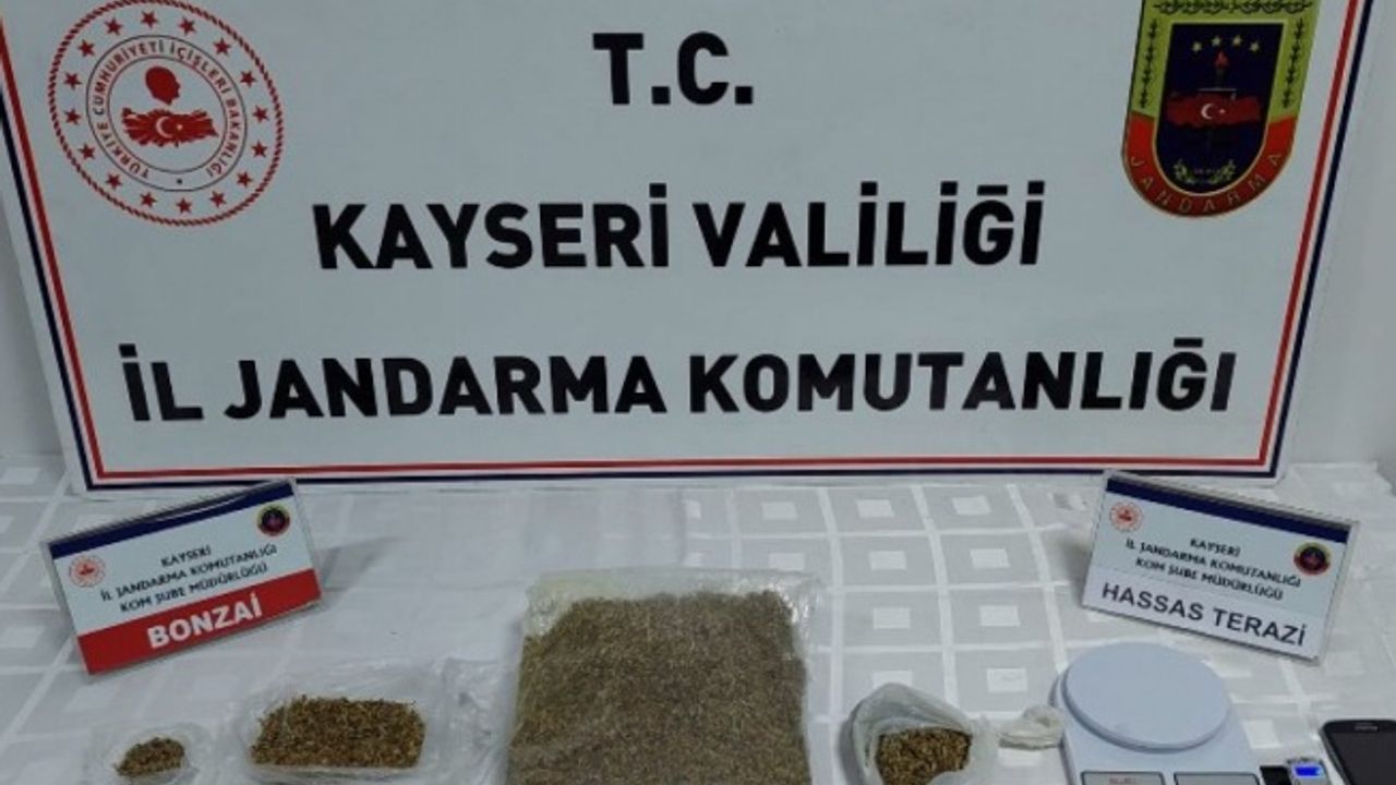 Kayseri Jandarma Komutanlığı KOM Şube Müdürlüğü ve Kocasinan İlçe Jandarma Komutanlığı ekiplerince uyuşturucu veya uyarıcı madde ticareti yapan şahısların yakalanmasına yönelik yapılan araştırma ve çalışmalar sonucunda elde edilen bilgiler doğrultusunda; Talas'ın Mevlana Mahallesi'nde şüpheli (L.K.) isimli şahsın ev ve aracında, Kayseri Cumhuriyet Başsavcılığı'ndan alınan arama kararı gereğince, Narkotik köpek timi eşliğinde yapılan arama neticesinde; Yaklaşık (1.021) gr. bonzai uyuşturucu maddesi olduğu değerlendirilen madde ve 2 adet hassas terazi ele geçirildi. Şüpheli gözaltına alındı.