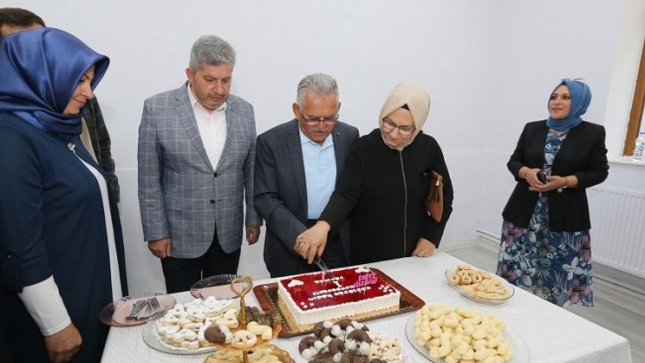 Kayseri'nin Bünyan ilçesinde kadın kooperatiflerini ziyaret eden Büyükşehir Belediye Başkanı Dr. Memduh Büyükkılıç, Çağlayan Kadın Kooperatifi’nin 1’inci yıldönümüne özel hazırlanan gilaburulu pastayı eşi Dr. Necmiye Büyükkılıç ile keserek, tadına baktı.Mehmet UZEL (KAYSERİ İGFA)