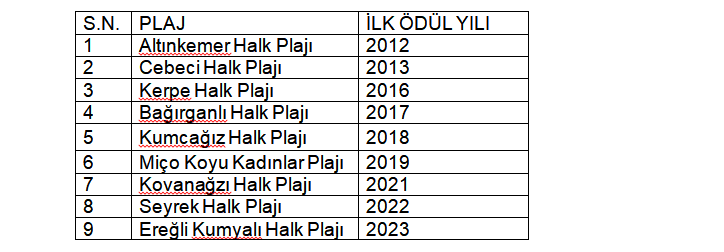 Türkiye, bu başarıyla İspanya ve Yunanistan’ın ardından dünyada 3. sıradaki yerini korudu. Uluslararası Mavi Bayrak Jürisi tarafından 2025 yılı Mavi Bayrak ödüllerinin açıklanması sonucunda; Karamürsel ilçesinde bulunan Altınkemer Halk Plajı ve Ereğli Kumyalı Halk Plajı ile Kandıra ilçesinde bulunan Cebeci, Kerpe, Bağırganlı, Kumcağız, Miço Kadınlar, Kovanağzı ve Seyrek plajları olmak üzere toplam 9 adet plaj “Mavi Bayrak” ile ödüllendirildi.