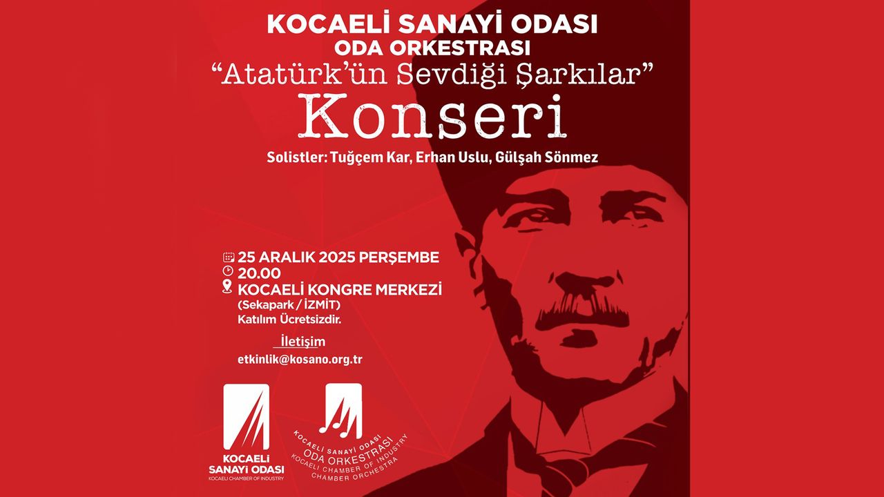 Kocaeli Sanayi Odası Oda Orkestrası’nın İTÜ Türk Müziği Devlet Konservatuvarı Öğretim Üyeleri; Tuğçem Kar, Erhan Uslu ve Gülşah Sönmez’in icra edecekleri ‘Atatürk’ün Sevdiği Şarkılar Konseri’ Kocaeli Uluslararası Kongre Merkezi’nde 25 Aralık 2025 Perşembe günü saat 20.00’de gerçekleştirilecek.