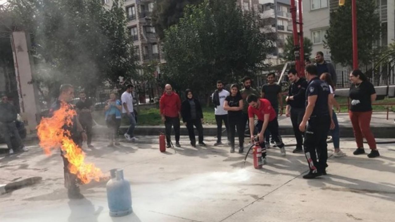 Eğitim alan Manisa UMKE sağlık personelleri, yangına karşı ilk müdahaleyi ve yangını söndürmeyi uygulamalı olarak öğrendi.
