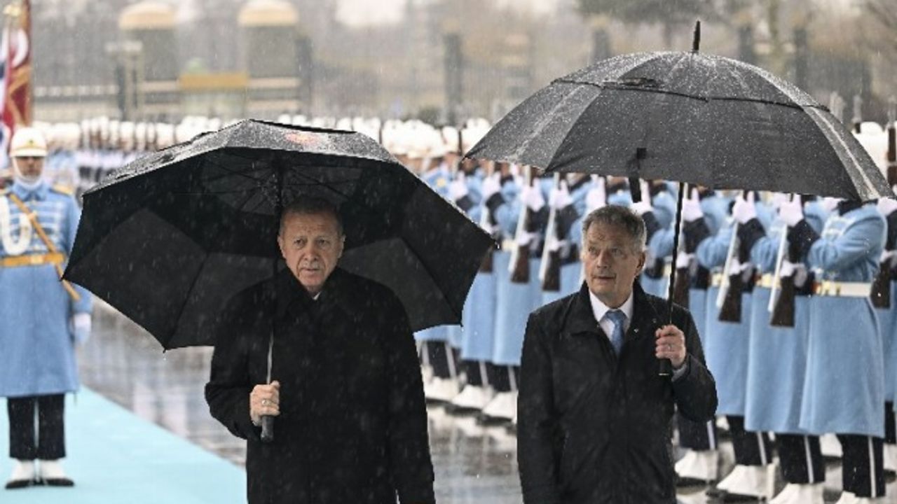 Finlandiya Cumhurbaşkanı Sauli Niinistö, Ankara'da Cumhurbaşkanı Erdoğan ile bir araya geldi. Niinistö, Cumhurbaşkanlığı Külliyesi'nde yağmur altında karşılandı.ANKARA (İGFA) - Cumhurbaşkanı Recep Tayyip Erdoğan, Türkiye'ye resmî ziyarette bulunan Finlandiya Cumhurbaşkanı Sauli Niinistö'yü Cumhurbaşkanlığı Külliyesi'nde törenle karşıladı.