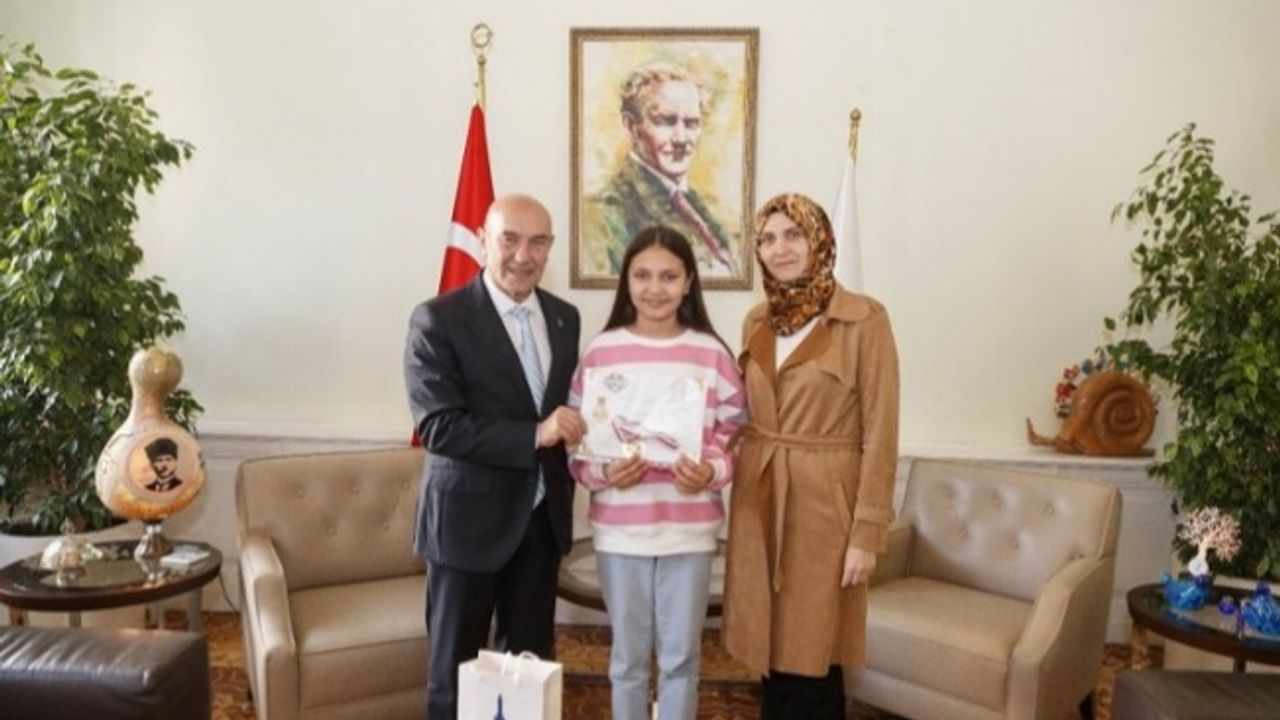 Okuduğu kitap içerisinden sorulan 8 soruyu da doğru yanıtlayarak Türkiye’yi başarıyla temsil eden 11 yaşındaki Zümra Evren, Başkan Tunç Soyer’i Egemenlik Evi’ndeki makamında ziyaret etti.