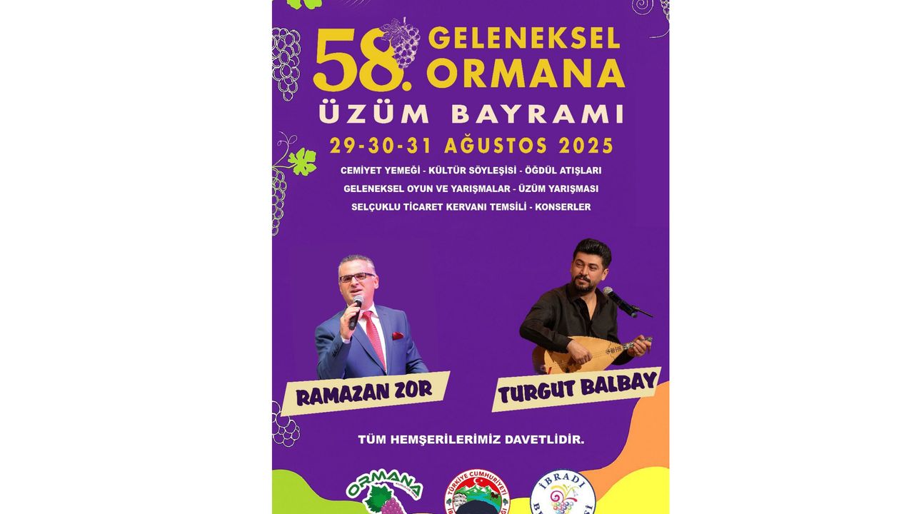 Antalya’nın İbradı ilçesine bağlı Ormana’da bu yıl 29-30-31 Ağustos 2025 tarihlerinde gerçekleştirilecek 58. Geleneksel Üzüm Bayramı, ünlü Türk müziği sanatçısı Ramazan Zor’un sahnesiyle taçlanacak.