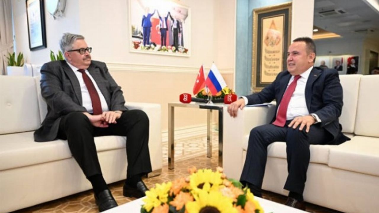 Rusya Federasyonu Ankara Büyükelçisi Aleksey Vladimiroviç Yerhov ve Antalya Başkonsolosu Sergey Vetrik, Antalya Büyükşehir Belediye Başkanı Muhittin Böcek’i ziyaret etti.ANTALYA (İGFA) - Antalya Büyükşehir Belediye Başkanı Muhittin Böcek, Rusya Federasyonu Ankara Büyükelçisi Aleksey Vladimiroviç Yerhov ve Antalya Başkonsolosu Sergey Vetrik’i ağırladı. Ziyaretten duyduğu memnuniyeti dile getiren Başkan Böcek, görevine yeni atanan Başkonsolos Sergey Vetrik’e de görevinde başarılar diledi.