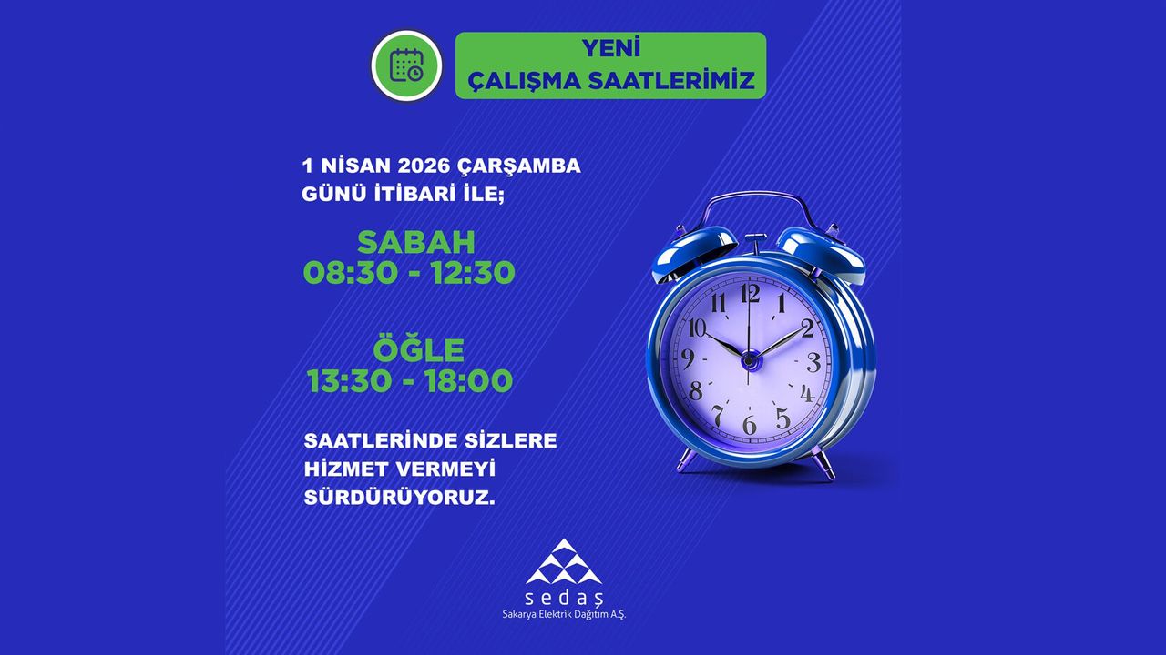 SEDAŞ’ın hizmet bölgesi olan Sakarya, Kocaeli, Bolu ve Düzce illerindeki tüm hizmet noktalarında 1 Nisan 2026 itibarıyla yeni mesai saatleri uygulanacaktır.