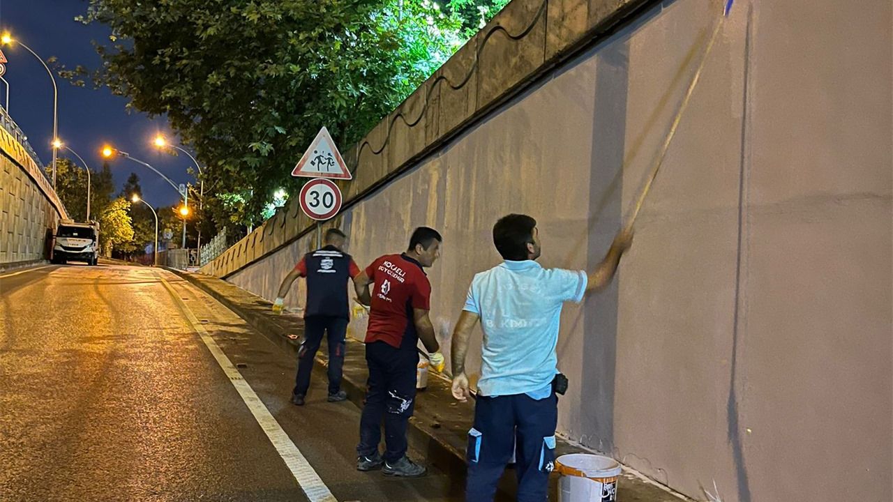 Taşıtların egzozlarından çıkan toz ve dumanla kirlenen duvarları önce yıkayan, ardından ise boyayan ekipler, deforme olan asfaltları da yeniledi.