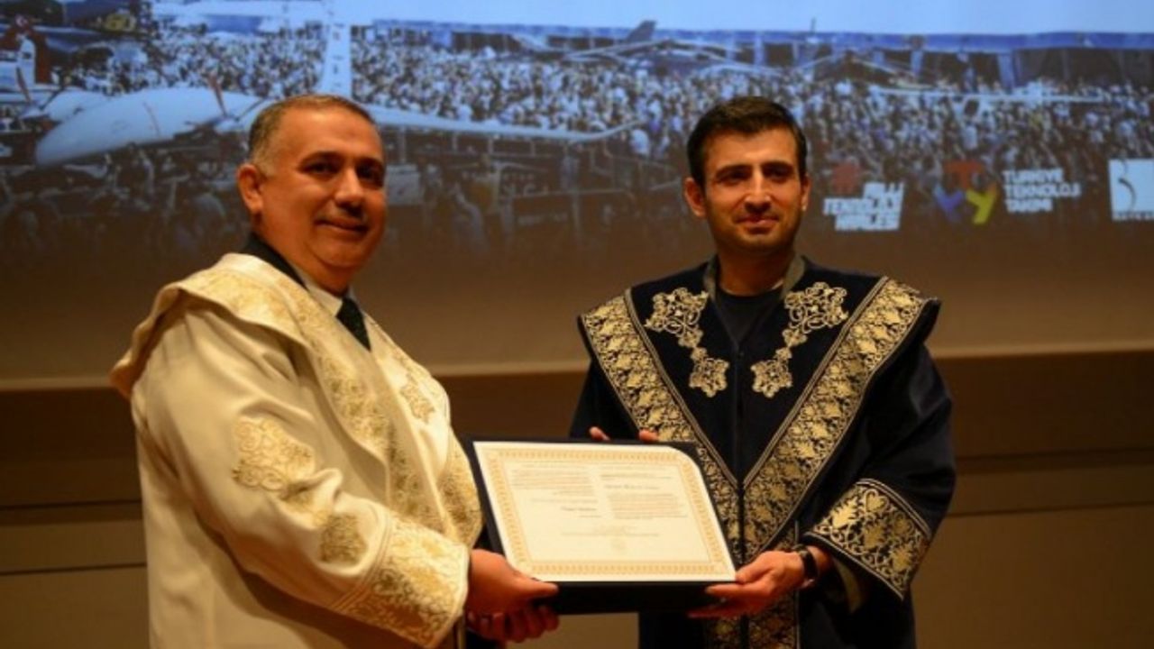 “Yapmış olduğu üst düzey araştırma geliştirme faaliyetleri ve bu faaliyetlerin sonucunda ortaya çıkan ürünleri ile bilimin ve teknolojinin ilerlemesine katkıda bulunması, çalışmaları ile yurt kalkınmasına, ülkemizin ekonomik ve sosyal gelişimine katkıda bulunması, Türk teknolojilerinin dışa açılması ve böylece teknik ve ekonomik gücümüzün uluslararası düzeyde etkinlik kazanmasına imkân sağlamış ve mesleğindeki çalışmalarında üstün başarısını kanıtlamış olması” dolayısıyla fahri doktor unvanı alan Elektronik ve Haberleşme Mühendisliği Bölümü 2002 yılı mezunumuz Selçuk Bayraktar, “fahri doktor” beratını Rektörümüz Prof. Dr. İsmail Koyuncu’nun elinden aldı.