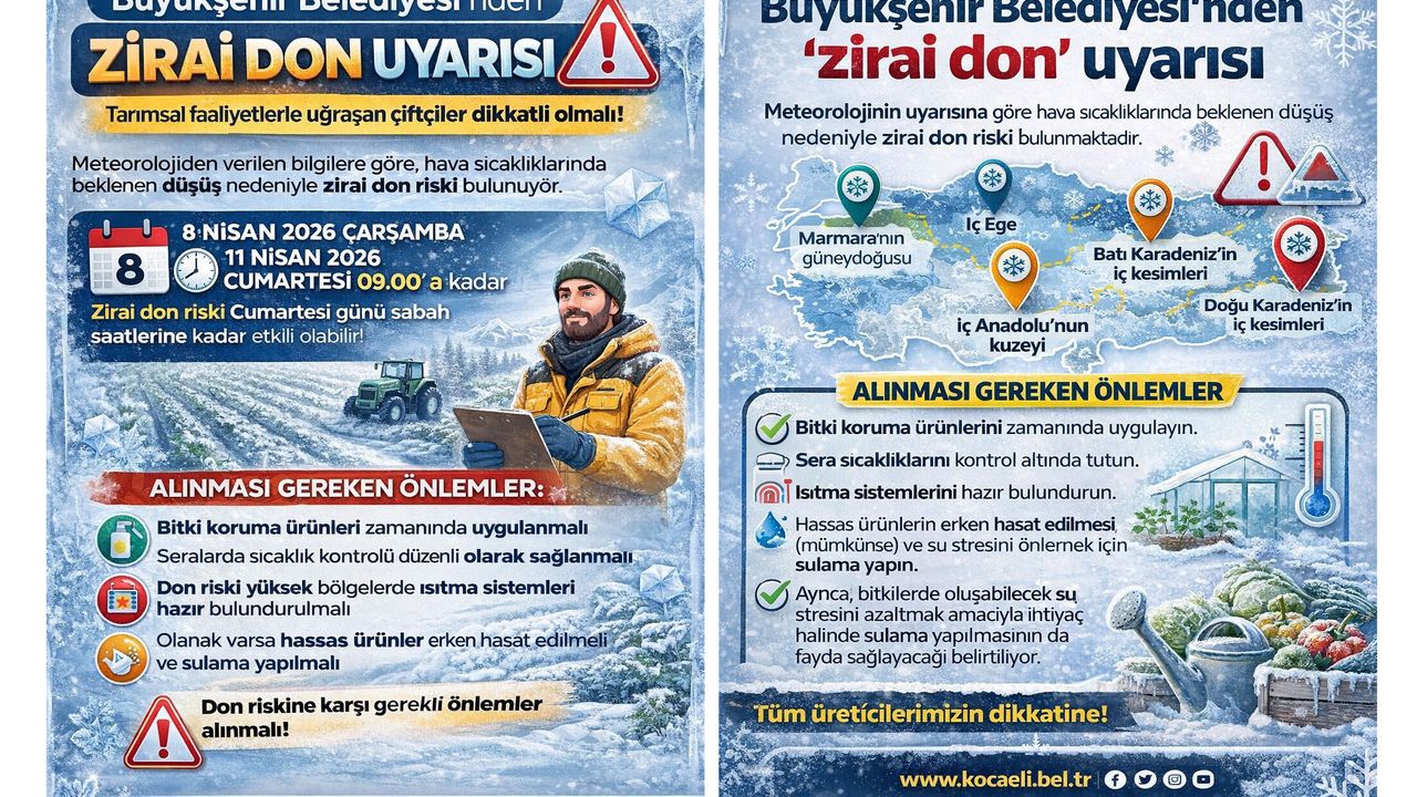 Kocaeli Büyükşehir Belediyesi, hava sıcaklıklarında beklenen düşüş nedeniyle zirai don riskine karşı vatandaşları ve üreticileri uyardı. Yapılan açıklamada, özellikle tarımsal faaliyetlerle uğraşan çiftçilerin dikkatli olmaları ve gerekli önlemleri almalarının büyük önem taşıdığı vurgulandı.