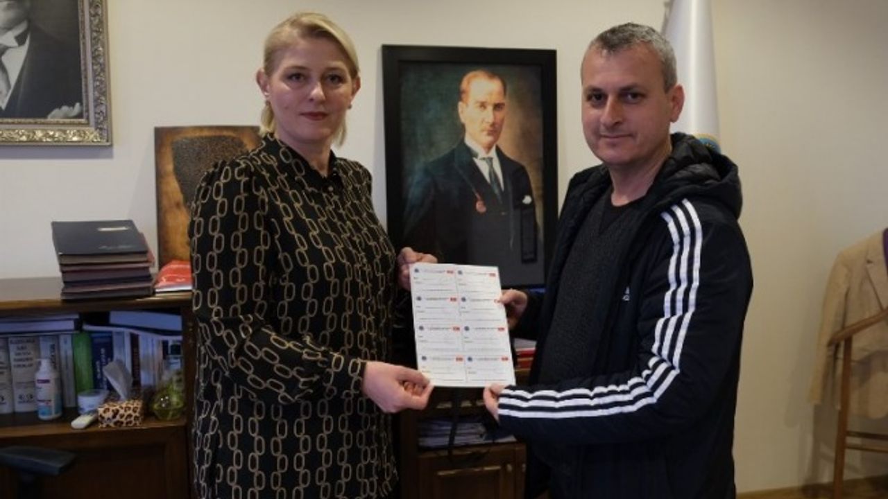 Uzunköprü Belediye Başkanı Özlem Becan , Depremzede vatandaşlar için hazırlanan ulaşım kartlarını, Santer Taşımacılık Kooperatifi Yönetim Kurulu Başkanı Savaş Özen'e takdim etti.