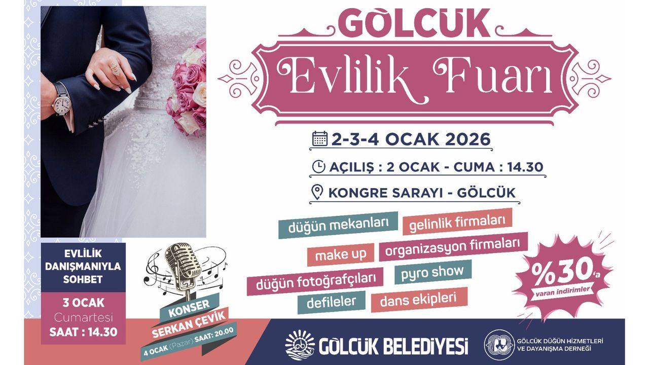 Gölcük Belediyesi, yeni evlenecek çiftlerin ihtiyaçlarını karşılamaya yönelik düzenlenecek fuara ev sahipliği yapacak. Evlilik hazırlığındaki çiftler için büyük fırsatlar sunan Gölcük Evlilik Fuarı, 2-3-4 Ocak 2026 tarihlerinde Gölcük Kongre Sarayı'nda gerçekleşecek.