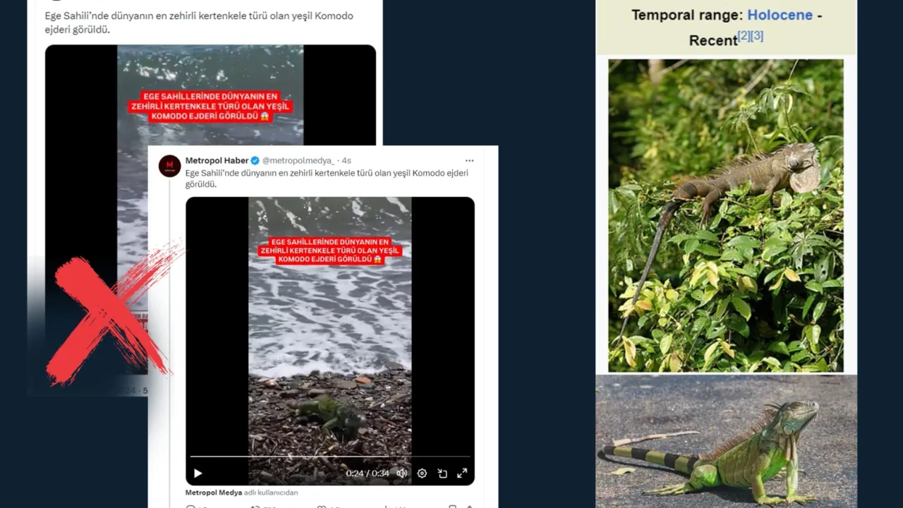 Ege Sahili’nde dünyanın en zehirli kertenkele türü olan yeşil Komodo ejderi görüldüğü iddiasının gerçeği yansıtmadığı belirtildi.ANKARA (İGFA) - Bazı sosyal medya hesaplarından paylaşılan görüntülerle ilgili, "Ege Sahili’nde dünyanın en zehirli kertenkele türü olan yeşil Komodo ejderi görüldü." iddiası doğru olmadığı açıklandı.